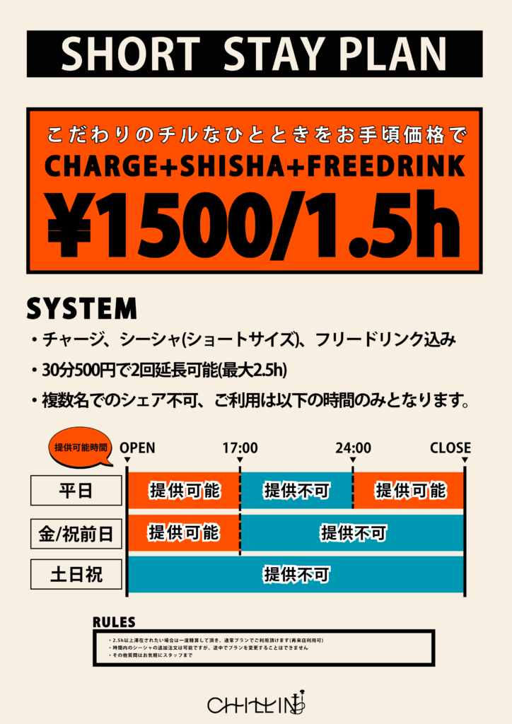「チャージ+シーシャ(ショートサイズ)+フリードリンク」がすべて込みで